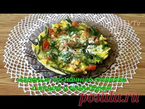 Жареные чесночные стрелки с яйцом и помидором. Roasted garlic arrows with egg and tomato.