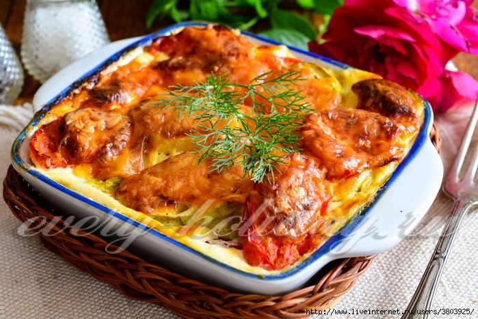 Кабачки с помидорами в духовке под пышной омлетно-сырной заливкой