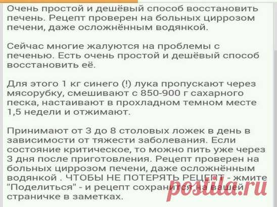 Очень простой и дешёвый способ восстановить печень. Рецепт проверен на больных циррозом печени, даже осложнённым водянкой. Сейчас многие жалуются на проблемы с печенью. Есть очень простой и дешёвый способ восстановить её. Для этого 1 кг синего (!) лука пропускают через мясорубку, смешивают с 850-900 г сахарного песка, настаивают в прохладном темном месте 1,5 недели и отжимают. Принимают от 3 до