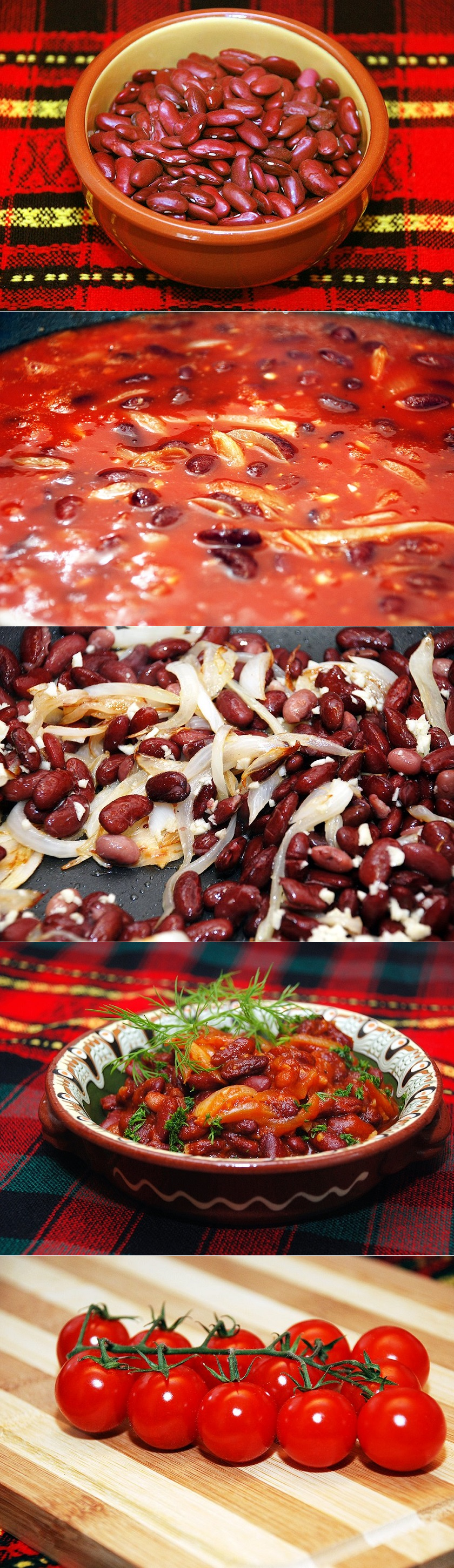 Рагу с фасолью =Красная фасоль 1 стак. Лук 1–2 шт. Помидор 0,5 кг Оливковое масло 2 ст. л. Чеснок 2–3 зуб. Укроп 1 пуч. Сахар 1 ч. л. Мускатный орех 3 г Черный перец (молотый) 1 щеп. Соль по вкусу