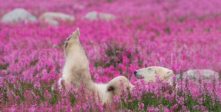 Белые медведи в цветущем поле, Северная Канада Белые медведи у большинства людей ассоциируются с арктическими пейзажами – с их снежными полями и ледяными глыбами. А как насчет полярных жителей, резвящихся в цветочном поле? Оказывается, в родных кр...