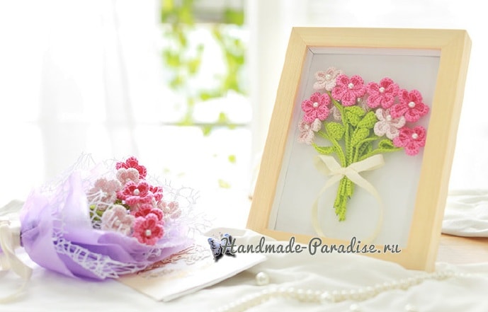 Букетик полевых цветов крючком - Эфария Очень нежный букетик полевых цветов крючком можно создать своими руками, связав его из тонкой пряжи «ирис». Прилагаемая к публикации схема вязания поможет вам легко и очень быстро справиться с работой по созданию цветов. Букетик цветов можно подарить ценительнице ручной работы. Вязаные миниатюрные цветы можно также использовать для создания декоративного панно или просто поставить в вазочку