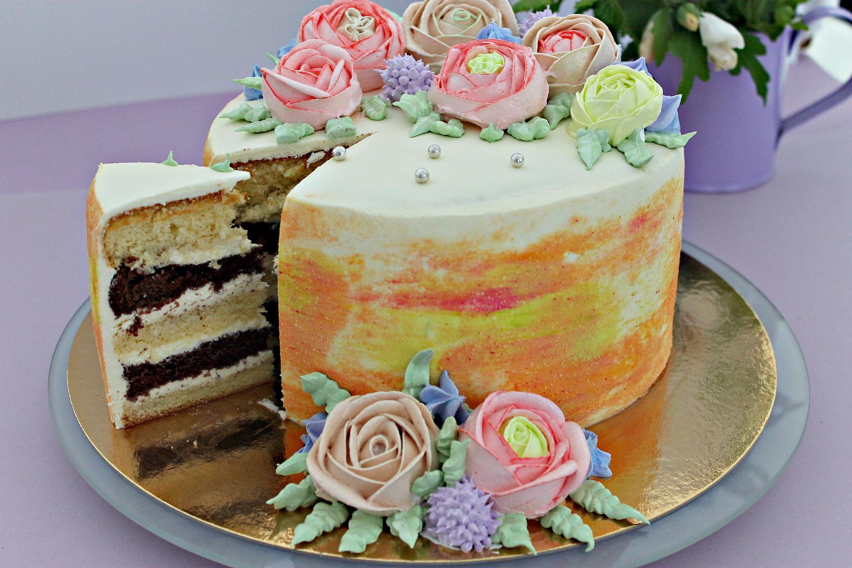 Торт "Летний экспромт". Польский бисквит , крем-пломбир. Обмазан творожным кремом. И украшен Белково-заварным.
