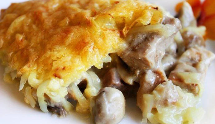 — 2 шт куриной грудинки— 250 гр грибов (любых)— 4 средних картофелины— 1 луковица— 1 ст. ложка муки— 250 мл молока— 150 гр сливок— 100 гр тёртого сы…
