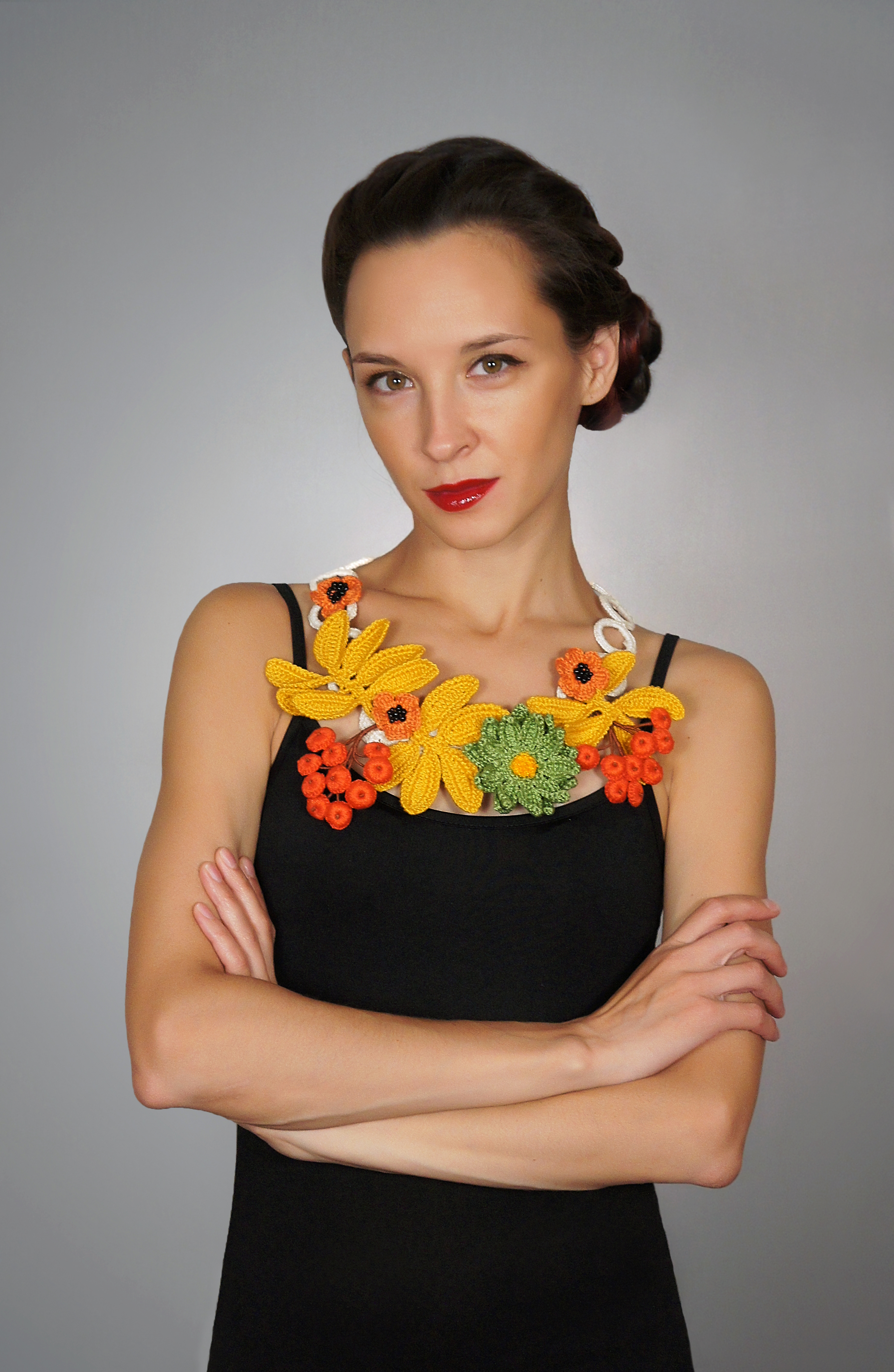 Колье "Осень". Материалы: пряжа "Ирис", отбеленный лен для основы, мелкие бусины, металлические кольца, проволока