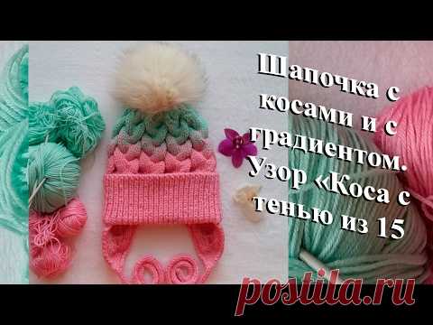 Шапка с косами и с градиентом узором "Коса с тенью из 15 петель". Спицами