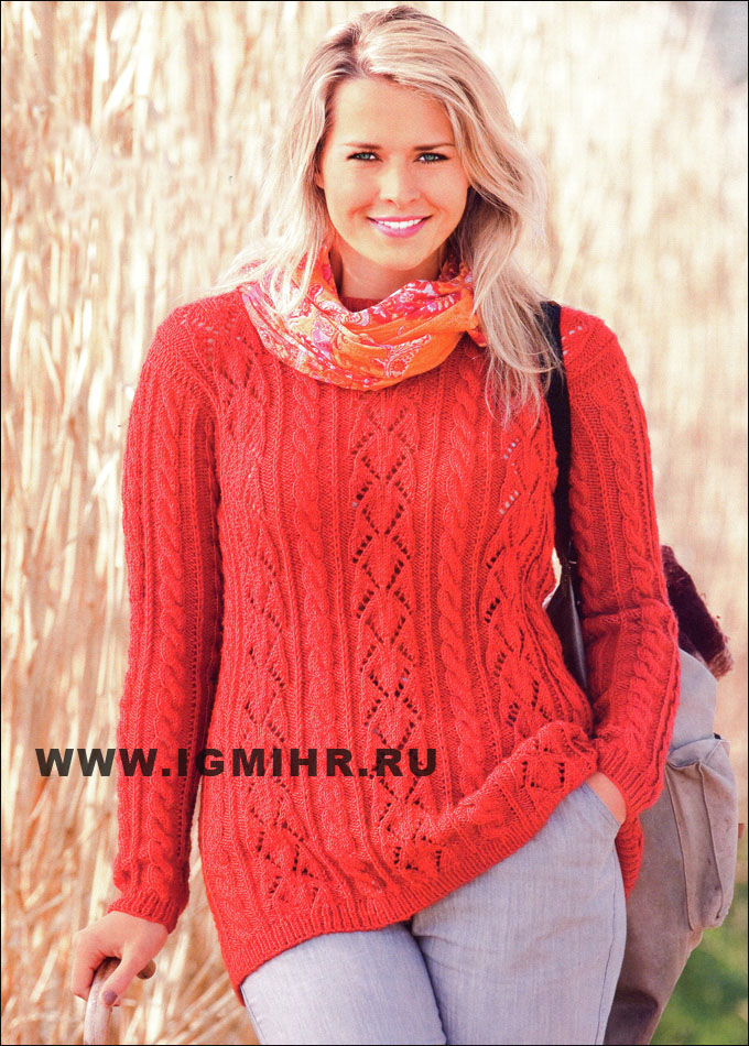 Красный пуловер с косами и ажурными полосами. Большие размеры. Спицы