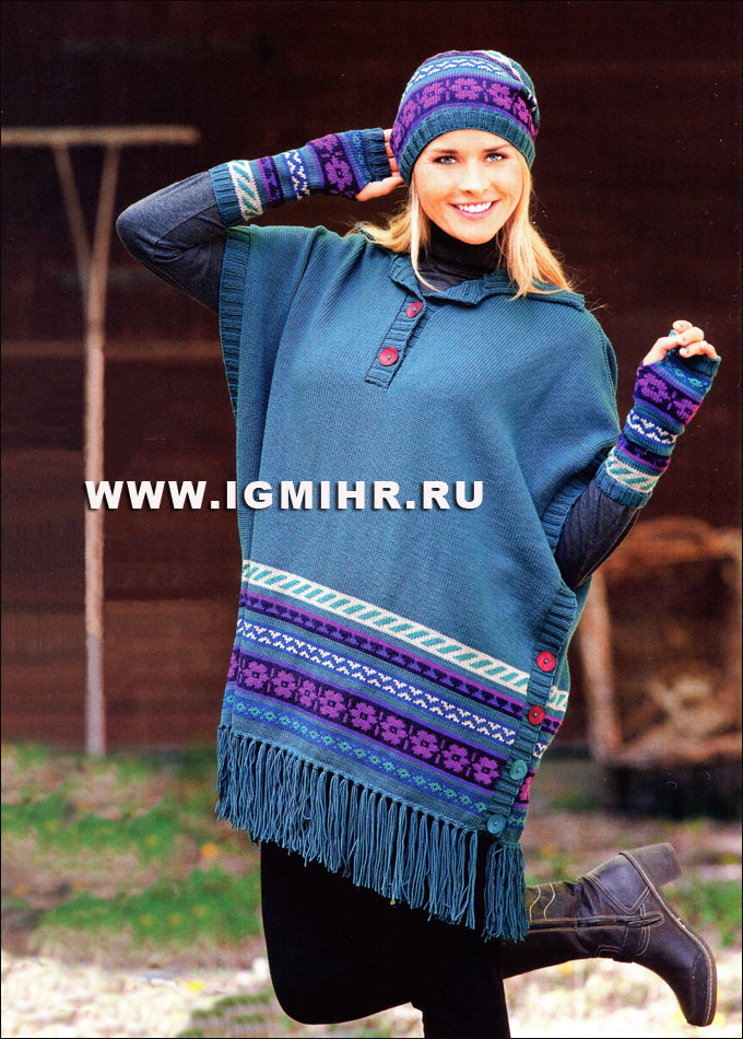 Стильное пончо с жаккардовыми узорами, дополненное шапкой, хомутом и митенками. Большие размеры. Спицы