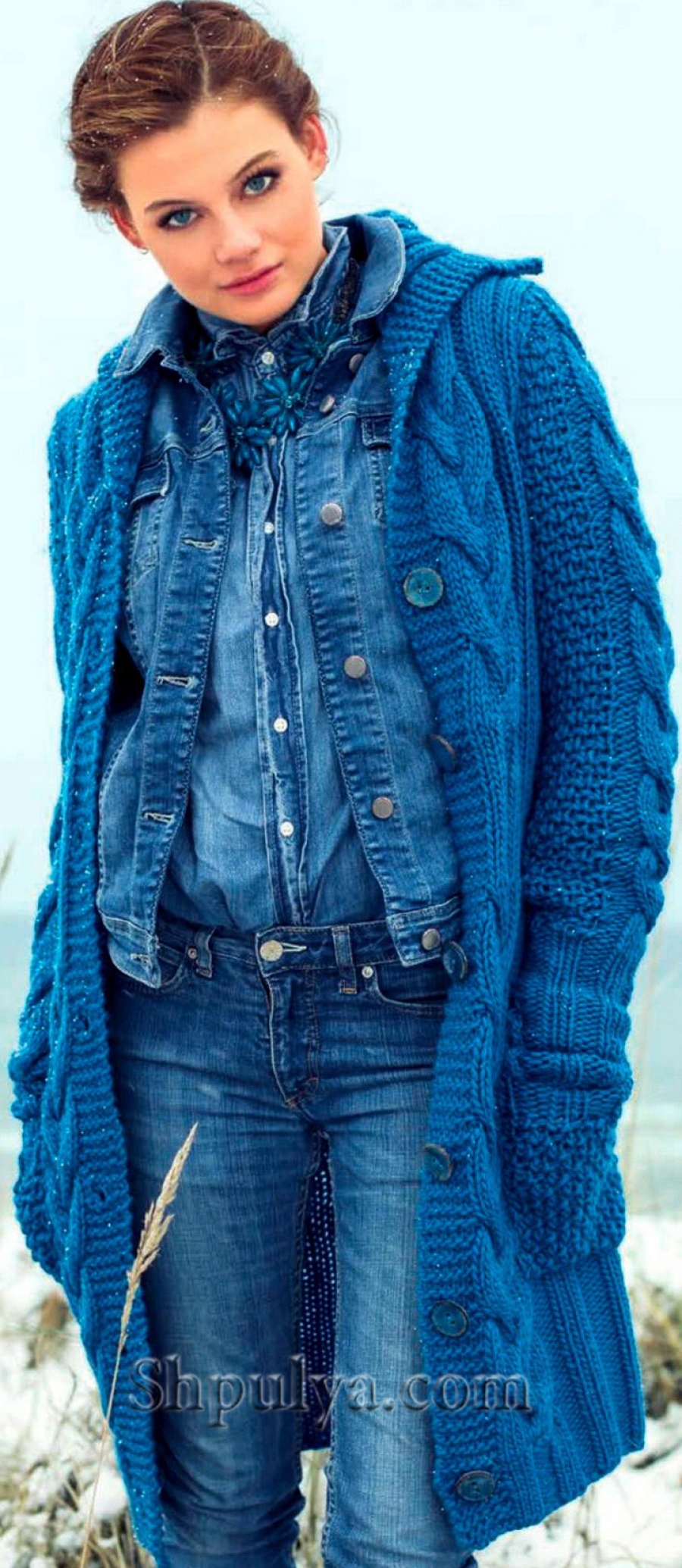 Теплое синее пальто с карманами, вязаное спицами - SHPULYA.com