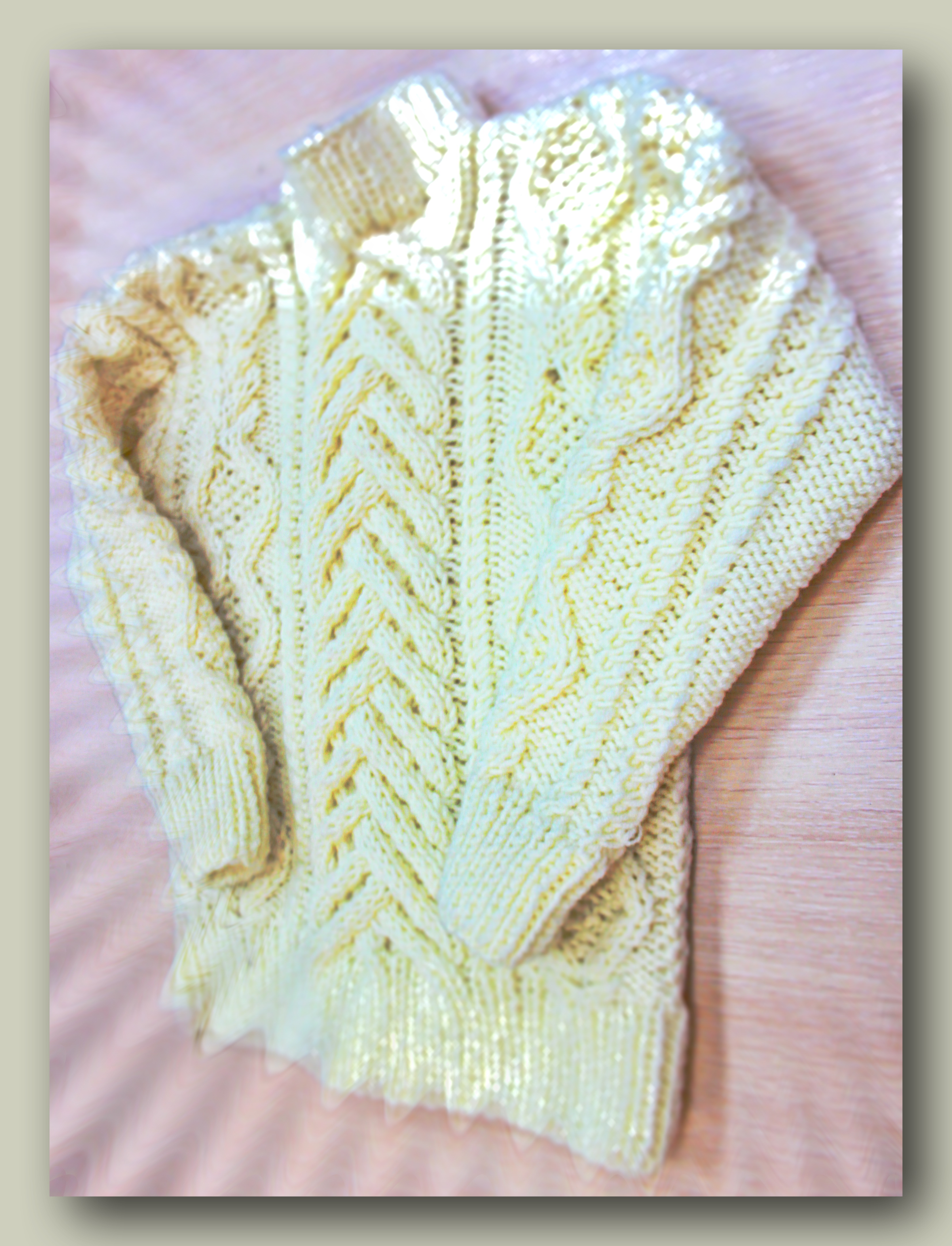 Джемпер связан для мальчика на рост 104-110 см в стиле аранского вязания. Рельефные косы и сложные переплетения делают данную модель необычайно притягательной. Рельефные рисунки идут спереди, по спинке и рукавам модели.
