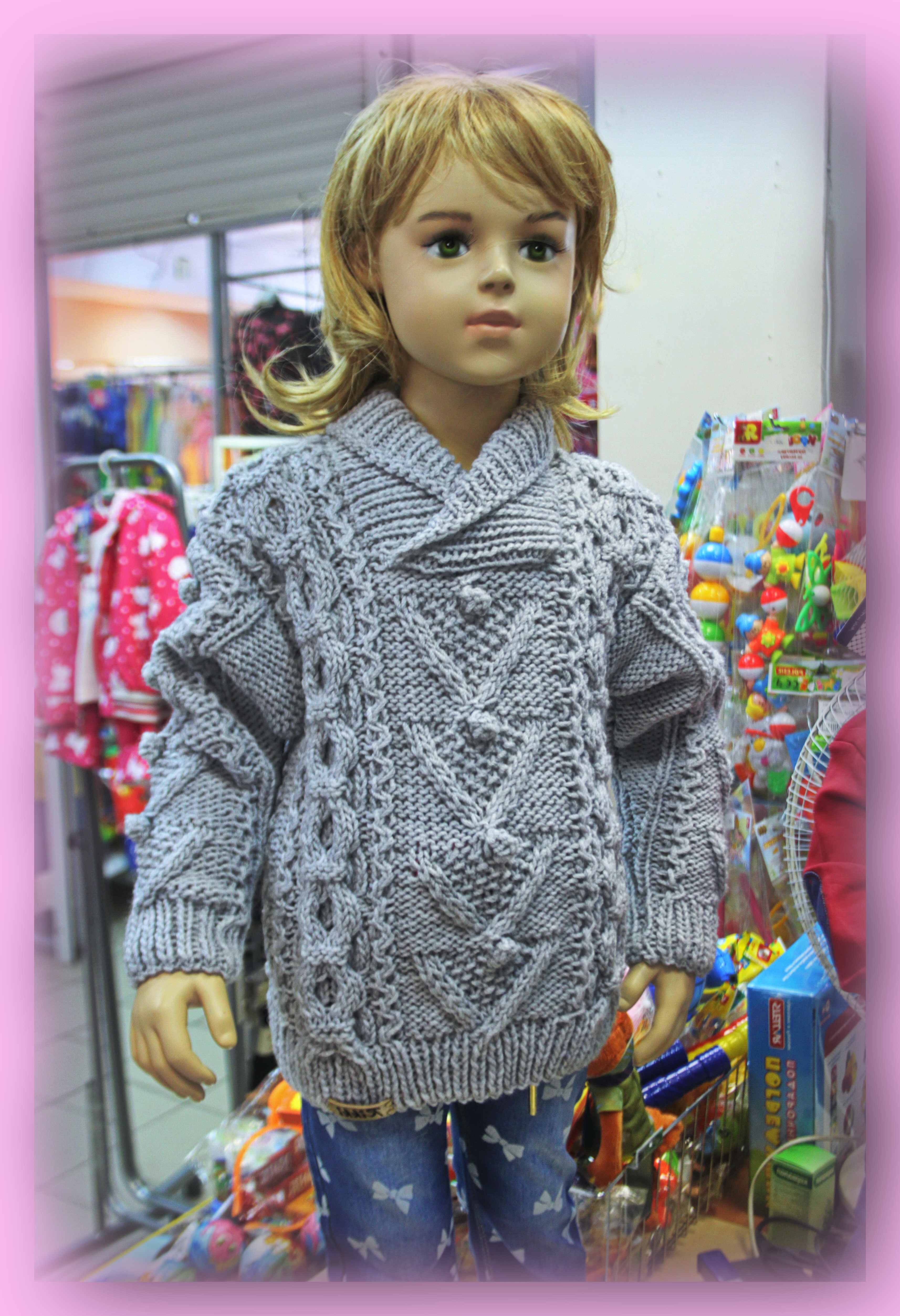 Джемпер связан для ребенка на рост 104-112 см в стиле аранского вязания. Рельефные косы и сложные переплетения невольно приковывают взгляд.. Рельефные рисунки идут спереди, по спинке и рукавам модели. Яркая, индивидуальная разработка модели, надеюсь, приведет в восторг немало ценителей прекрасного.
