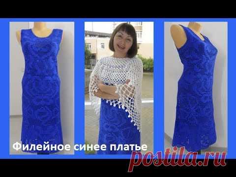Филейное синее платье завершение. Crochet dress ( узор № 67)