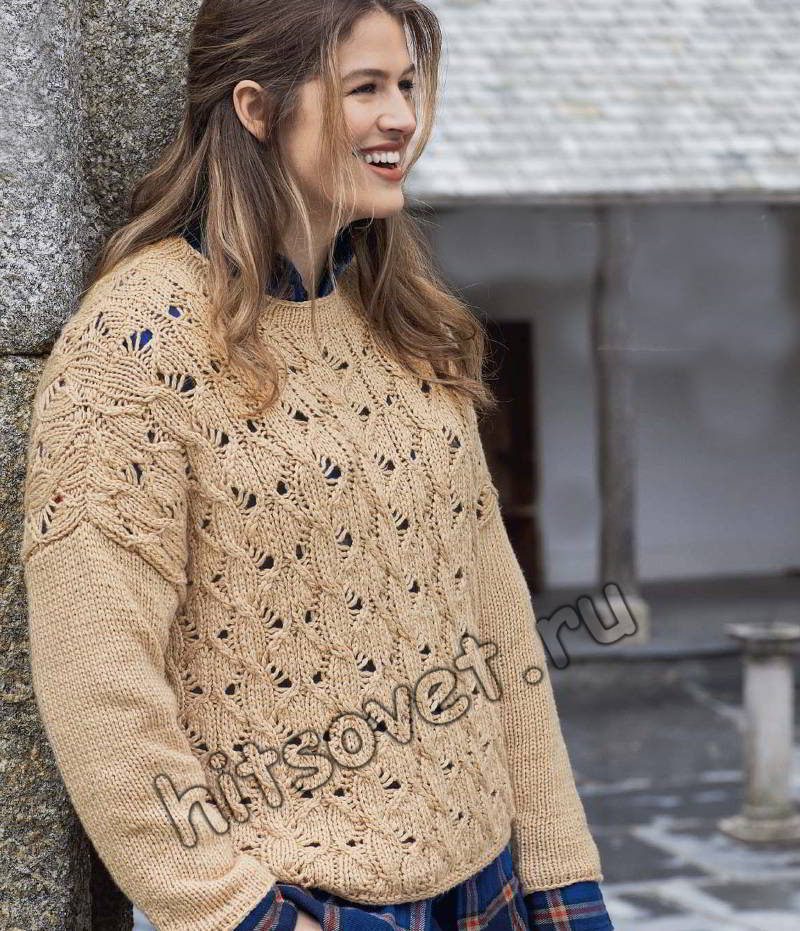 Пуловер для полных - Хитсовет Пуловер для полных. Модный пуловер для полных женщин с красивым рельефным узором со схемой и бесплатным описанием вязания.