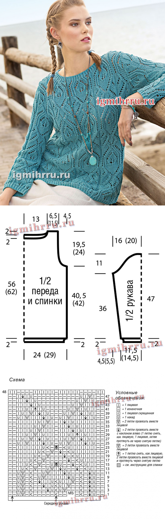 Бирюзовый пуловер с ажурным узором из «листьев» и ромбов. Вязание спицами