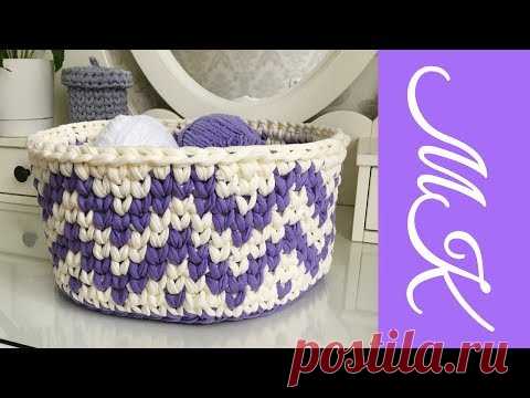 Корзинка крючком из трикотажной пряжи (ленточной). How to make crochet basket