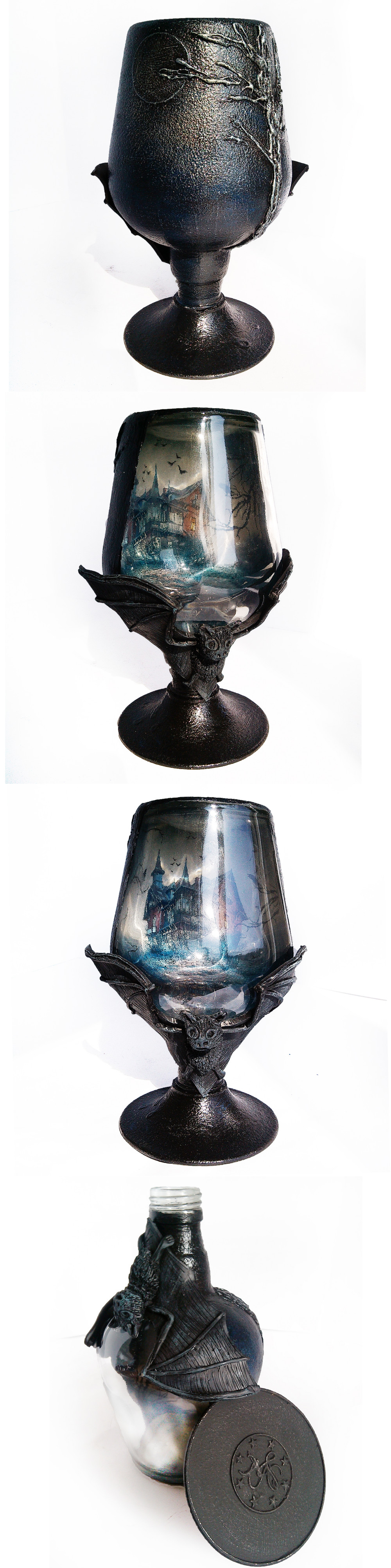 Готический кубок с летучей мышью ручной работы чёрного цвета с доставкой по России и СНГ, объём 0.5 л. На кубке изображена картинка дом с призраками.
