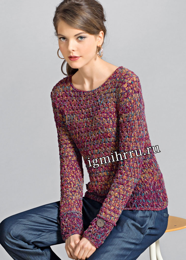 Меланжевый пуловер с узором из снятых петель. Вязание спицами