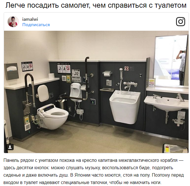 Легче посадить самолет, чем справиться с туалетом.Панель рядом с унитазом похожа на кресло капитана межгалактического корабля — здесь десятки кнопок: можно слушать музыку, воспользоваться биде, подогреть сиденье и даже включить душ. В Японии часто моются, стоя на полу. Поэтому перед входом в туалет надевают специальные тапочки, чтобы не намочить ноги. 18 безумных вещей, которые случаются только в Японии