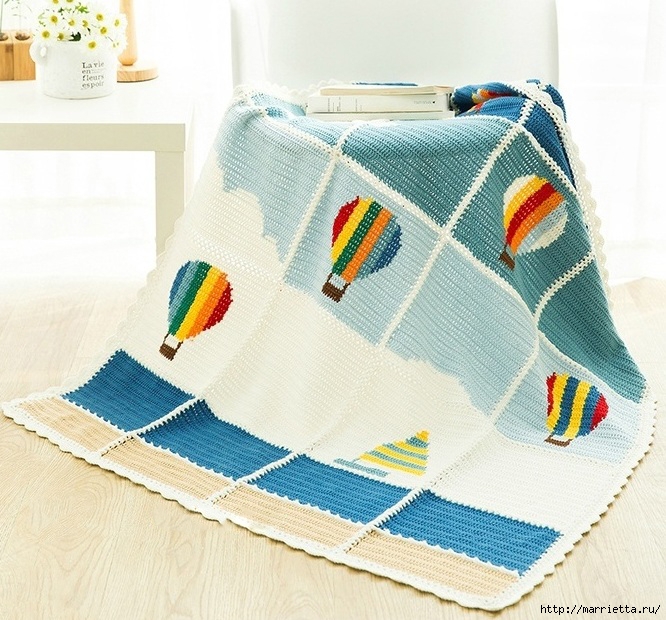 Крючком. Детский плед с морем, парусниками и воздушными шарами