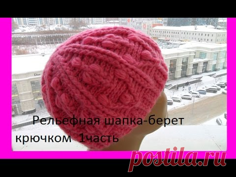 Рельефная шапка-берет крючком - 1 часть .Relief takes hat-hook. (Шапка #43)