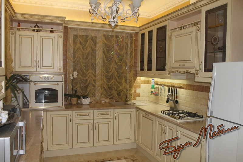 Вариант П-образной кухни в Классическом стиле с фасадами МДФ эмаль с патиной золото