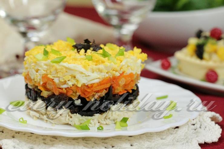 Слоеный салат с отварной курицей и черносливом, рецепт с фото