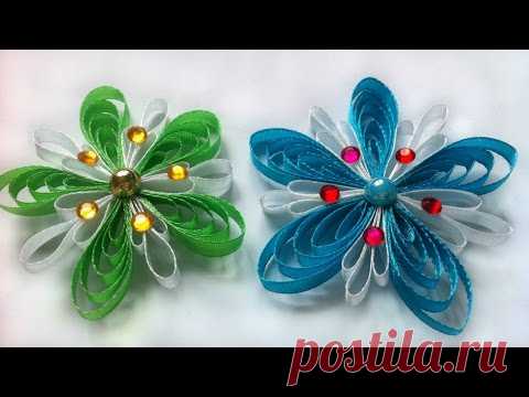 Новогодняя Снежинка на елку из тонких атласных лент в технике квилинг своими руками Мастер класс