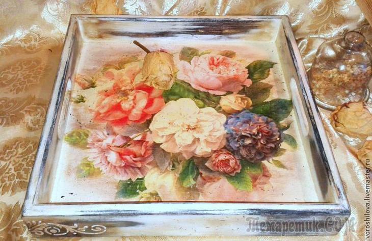 Декорируем поднос "Английские розы" Со слов автора. В этом мастер-классе хочу показать, как я декорировала поднос. В мастер-классе вы увидите: декупаж, многослойное окрашивание и протравливание древесины, одношаговый кракелюр на ПВА. По...