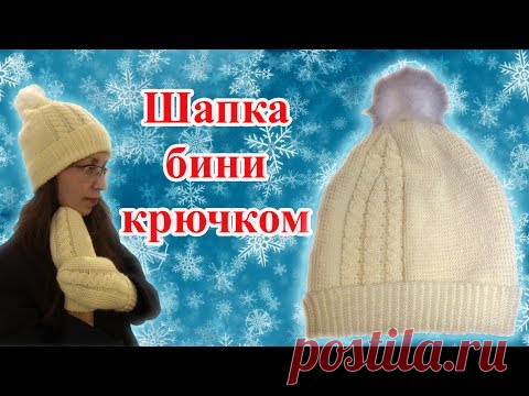 DIY Теплая зимняя шапка бини с меховым помпоном и косами крючком