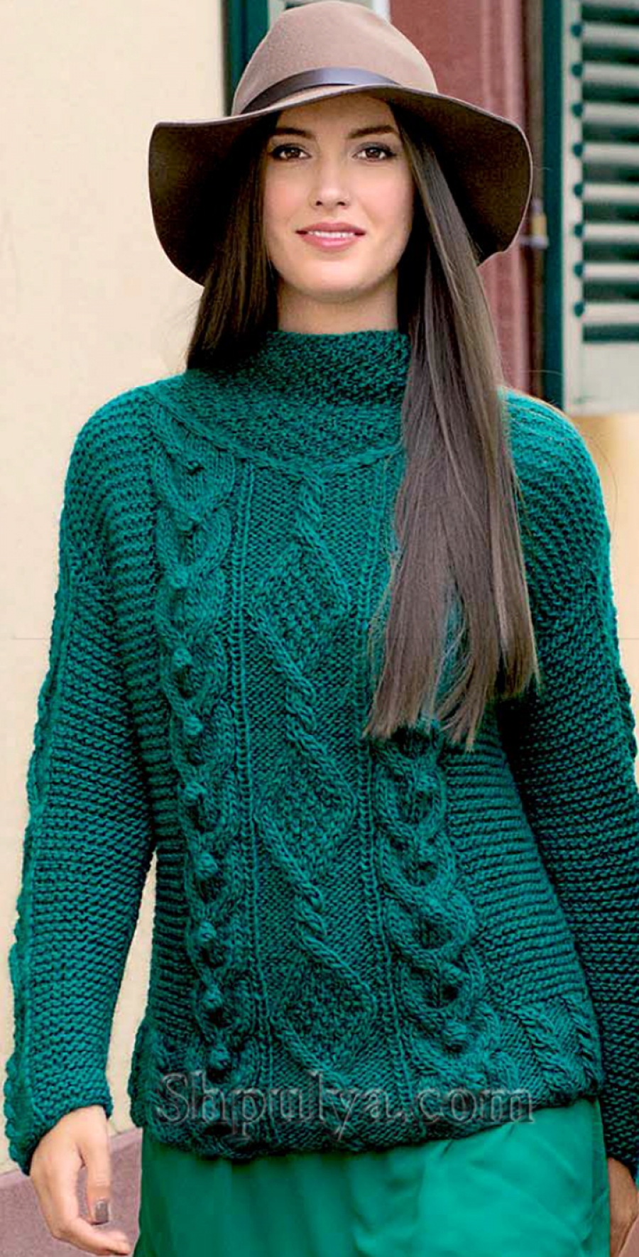 Изумрудный пуловер с узором из кос, вязаный спицами - SHPULYA.com