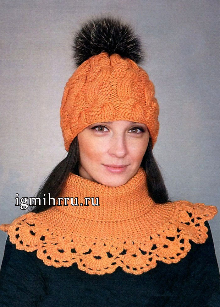Комплект «Осенний блюз»: оранжевая шапочка с помпоном и шарф-воротник. Вязание спицами и крючком