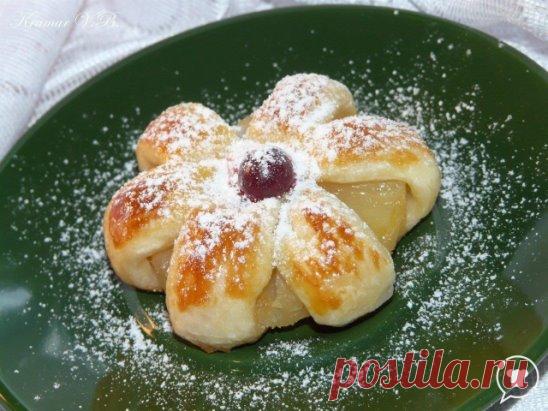 "Ромашки" Нам потребуется: ананасы консервированные колечками 1 банка тесто слоеное 1 упаковка сахарная пудра ягоды (клюква) Тесто раскатать и нарезать длинными полосками. С ананасов слить жидкость и обсушить на салфетке. Обернуть полоской теста колечко ананаса. Выложить "ромашки" на смазанный растительным маслом противень и смазать взбитым яичным желтком, а в серединку положить ягодку. Получившиеся "ромашки" поставить в заранее разогретую духовку и выпекать при 180С примерно15-20 минут, до гот