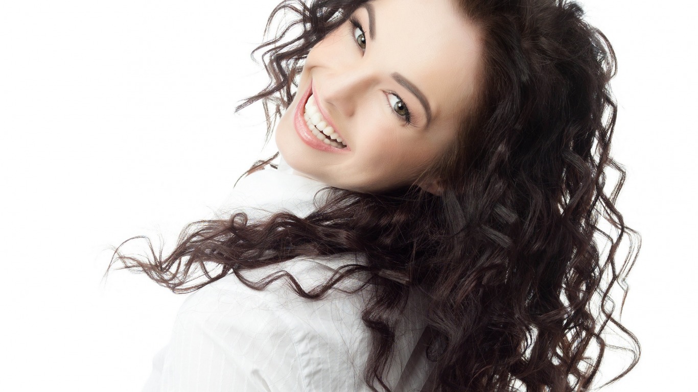 Скачать обои брюнетка, белый фон, девушка, волосы, раздел девушки в разрешении 1366x768