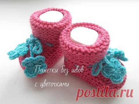 Вязание.Пинетки без швов с цветочками 3-6 мес