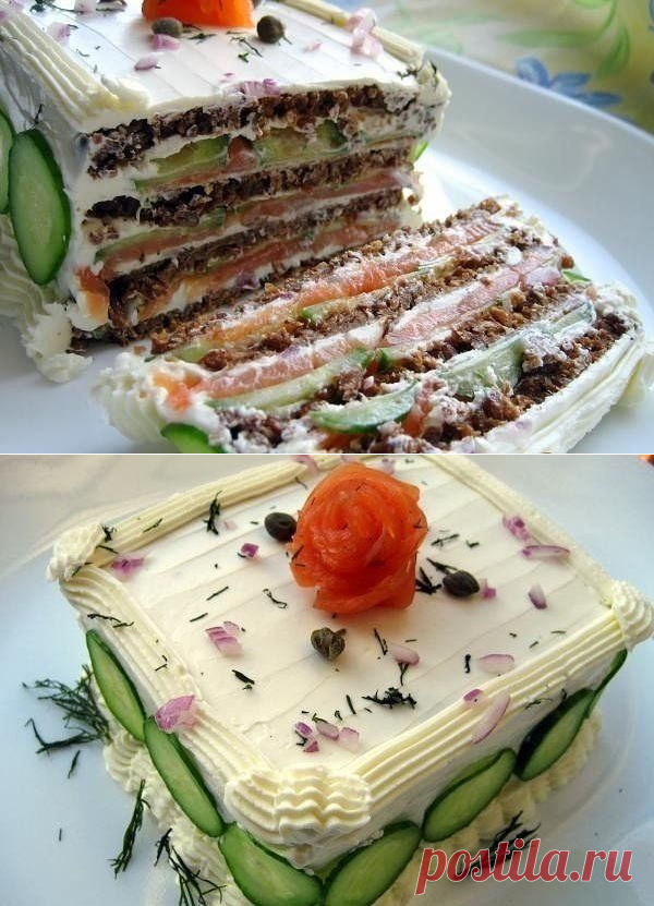 Красивый и невероятно вкусный праздничный бутербродный торт с хрустящими огурцами и копченым лососем, пропитанный и украшенный взбитым сливочным сыром.