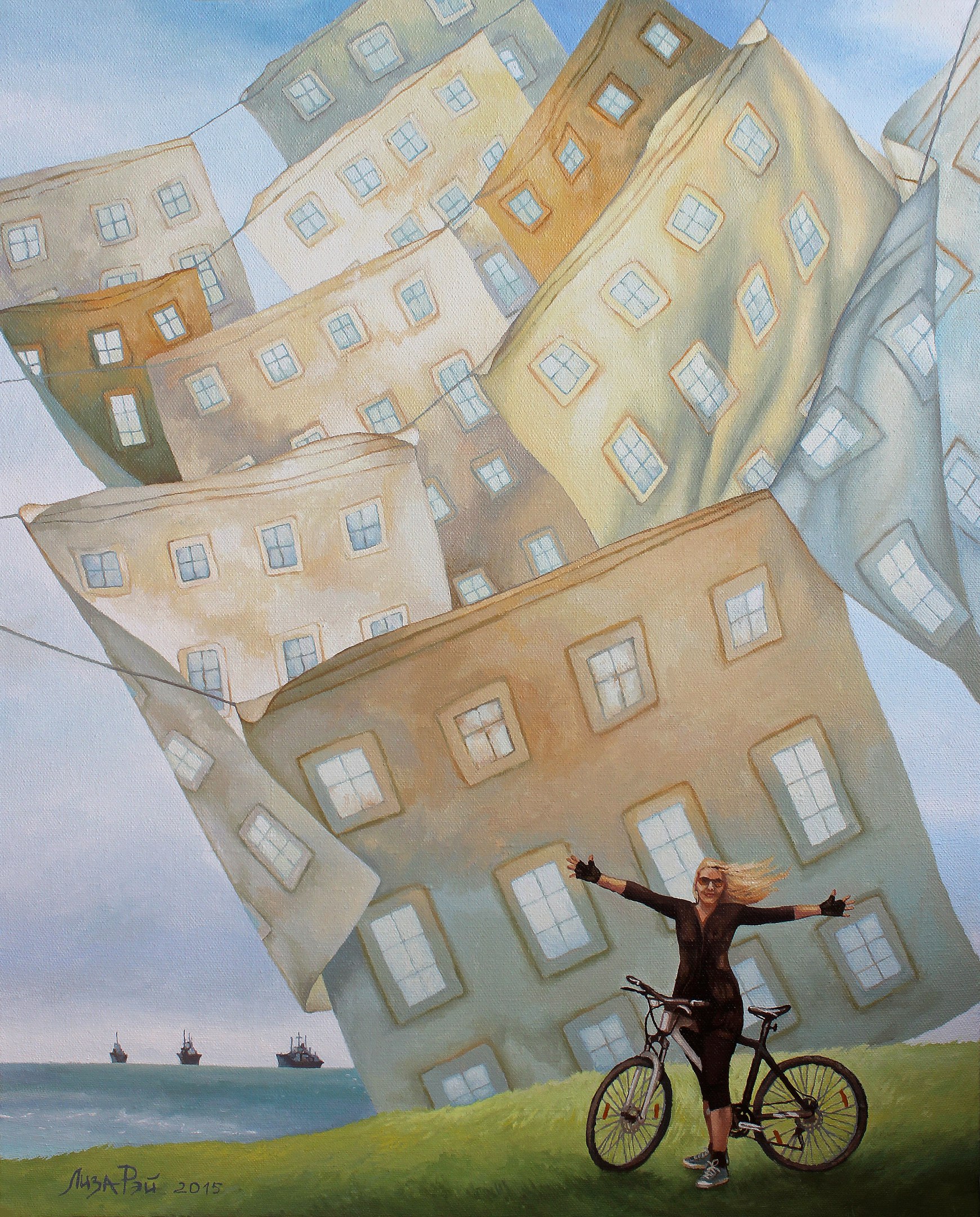 Лиза Рэй – Ветер в городе Lisa Ray - Wind in the city 80Х65, 2015 canvas, oil - холст, масло #surreal #surrealism #超現實主義 #surréalisme #シュールレアリズム #painting #LisaRay #сюрреализм #ЛизаРэй #живопись #картины #художник #art #ветер #белье #бельенаверевке #город #дома #велосипед #свобода #wind #underwear #city #bike #freedom