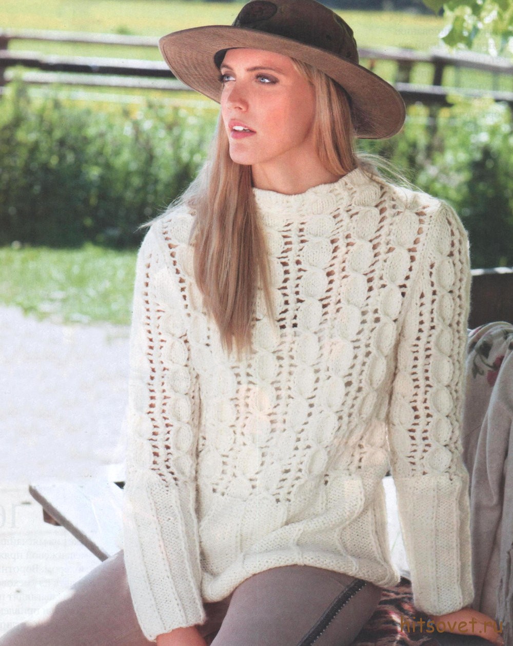 Вязание пуловера для женщин схема и описание - Хитсовет Вязание пуловера для женщин схема и описание. Вам потребуется: 450 (550) г белой пряжи Topas (41% шерсти, 32% полиакрила, 18% полиамида, 9% альпака, 115 м на 50 г); спицы № 8, круговые спицы № 8.