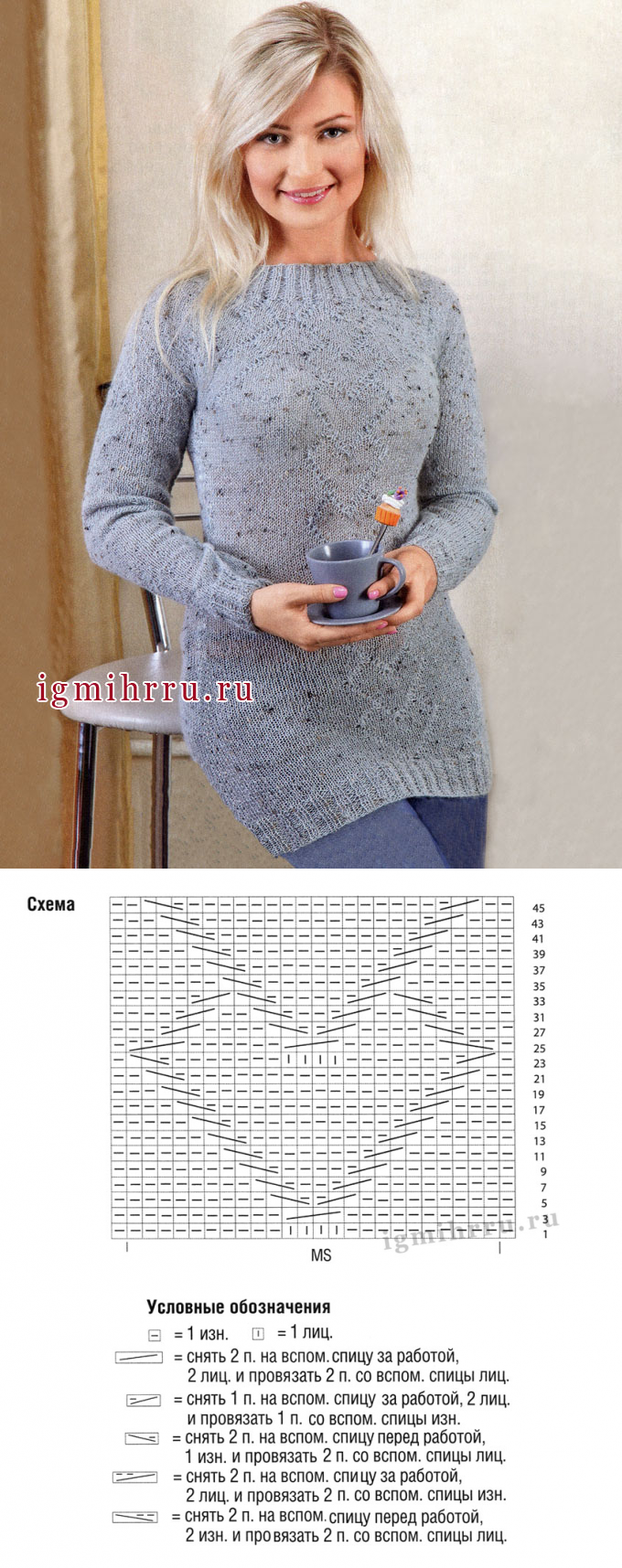 КРАСИВО И ТЕПЛО. СЕРО-ГОЛУБОЙ УДЛИНЕННЫЙ ПУЛОВЕР КЛАССИЧЕСКОГО КРОЯ. ВЯЗАНИЕ СПИЦАМИ