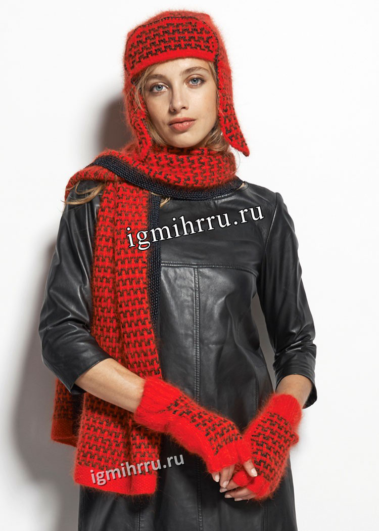 Стильный красно-черный комплект: шапочка, шарф и митенки. Вязание спицами
