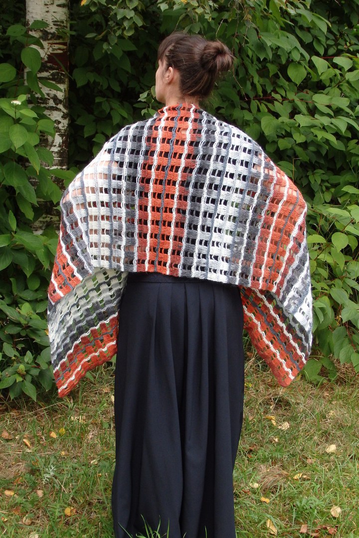 Полосатый палантин вязаный крючком "Краски осени". Мягкий, воздушный, пушистый авторский палантин, связанный крючком из полушерстяной пряжи производства Турция. Сочетает в себе горизонтальные цветовые полосы с плавным переходом цветов с вертикальными полосами, образованными рисунком (крючок). Показать полностью…