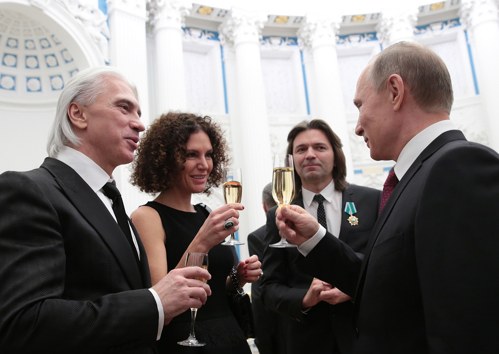 Оперный певец Дмитрий Хворостовский с супругой Флоранс, певец Дмитрий Маликов и президент России Владимир Путин после церемонии вручения государственных наград в Кремле, 2015 год. © Михаил Метцель/ТАСС. Подробнее на ТАСС: