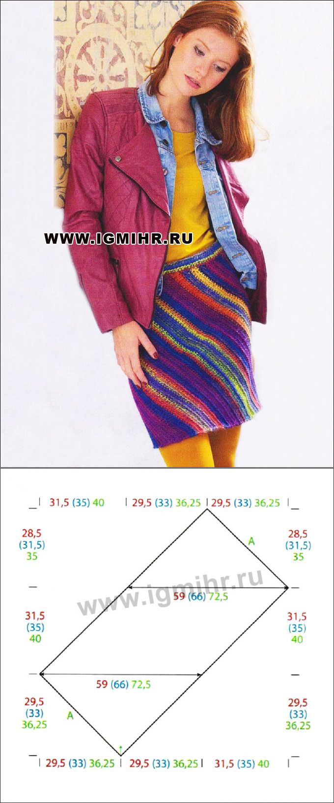Яркая диагональ. Юбка из секционно окрашенной пряжи, связанная единым полотном. Крючок