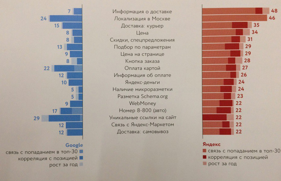 На графике приведены данные для Яндекса и Google по убыванию «силы» параметров.