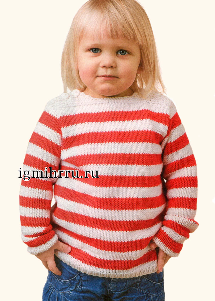 Для девочки 2-10 лет. Пуловер в красно-белую полоску. Вязание спицами для детей