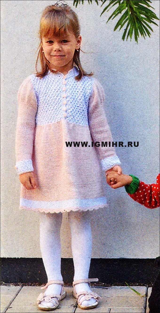 Нарядное платье в розово-белых тонах, для маленькой модницы. Спицы и Крючок