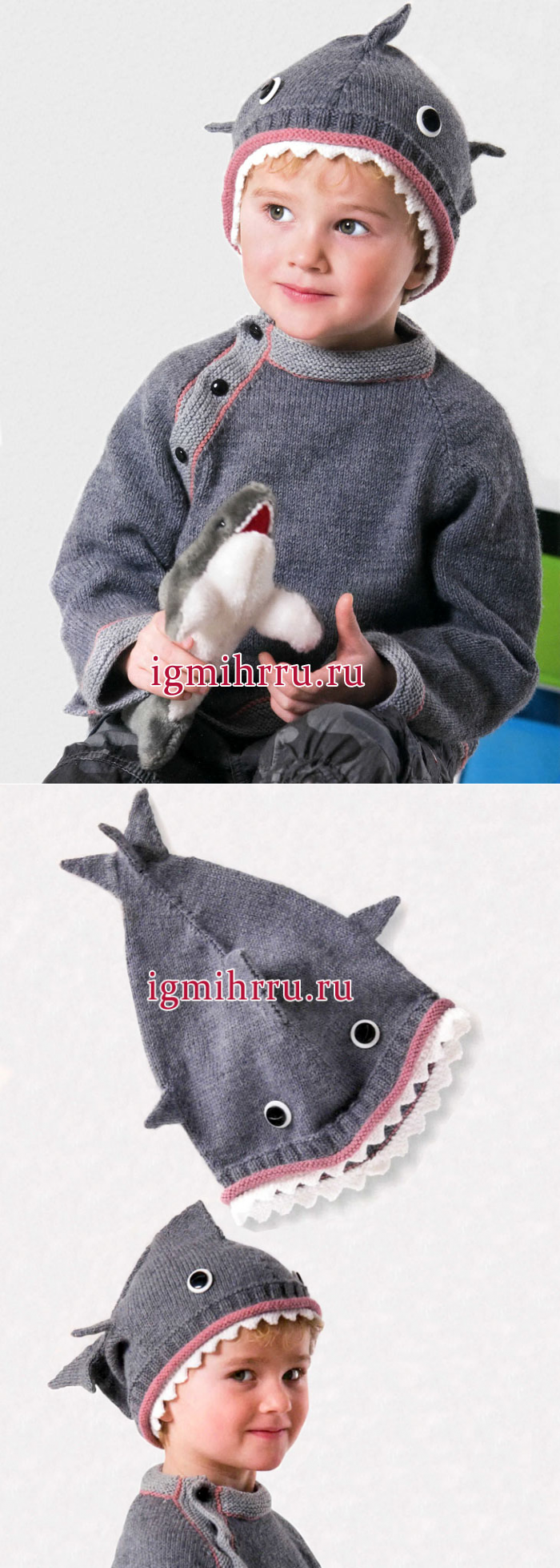 Шерстяной пуловер и шапка «Акула» для мальчика 1-4 лет. Вязание спицами для детей