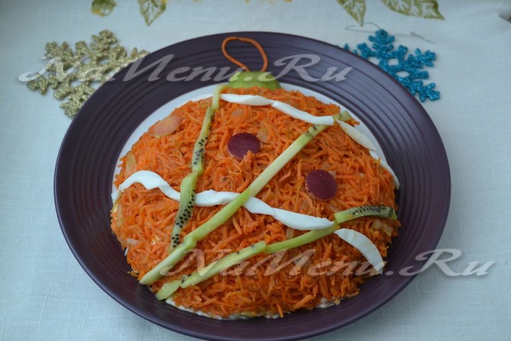 Салат в форме новогоднего шарика, рецепт с корейской морковью и киви