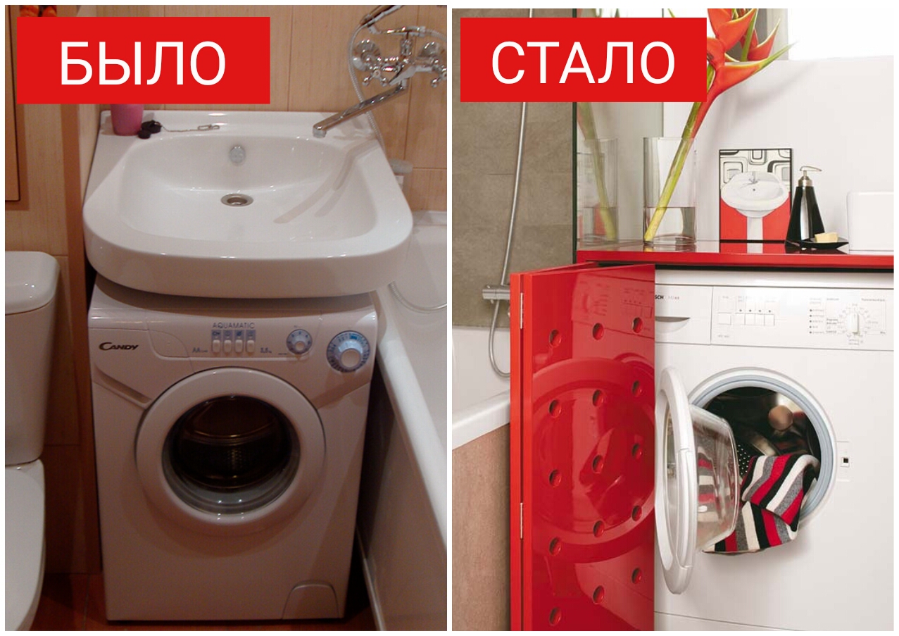 Самый предсказуемый вариант — вписать машинку под столешницу раковины. Очевидность подхода не делает его мене