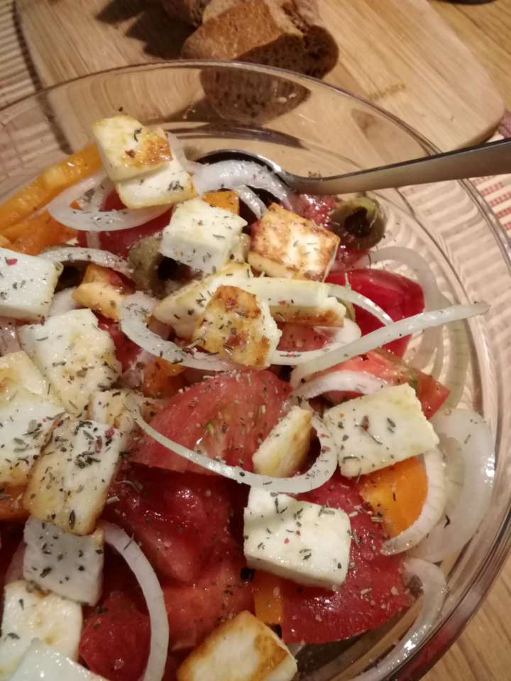 Овощной салат с жареным адыгейским сыром, помидорами, болгарским перцем, луком и оливками. Быстрое блюдо, которое готовится за 15 минут.