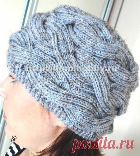 Запись на стене Шапка с поперечными косами. Основная часть шапки вяжется широкой полосой с переплетениями, где ширина – это высота тульи шапки (15-17 см), а длина полосы – обхват головы (50-56 см).Для вязания потребуется 100 гр полушерстяной пряжи (300м/100гр); на примере использована пряжа..
